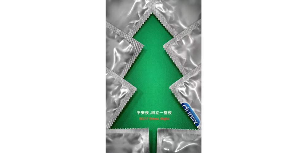 杜蕾斯的文案和海报一向让人拍案叫绝。圣诞节的海报中,杜蕾斯用产品拼成一棵圣诞树,配上下方“平安夜,树立一整夜”的文案,谐音梗让其与产品特点直接挂钩,但又不失趣味性,避免品牌落入俗套。