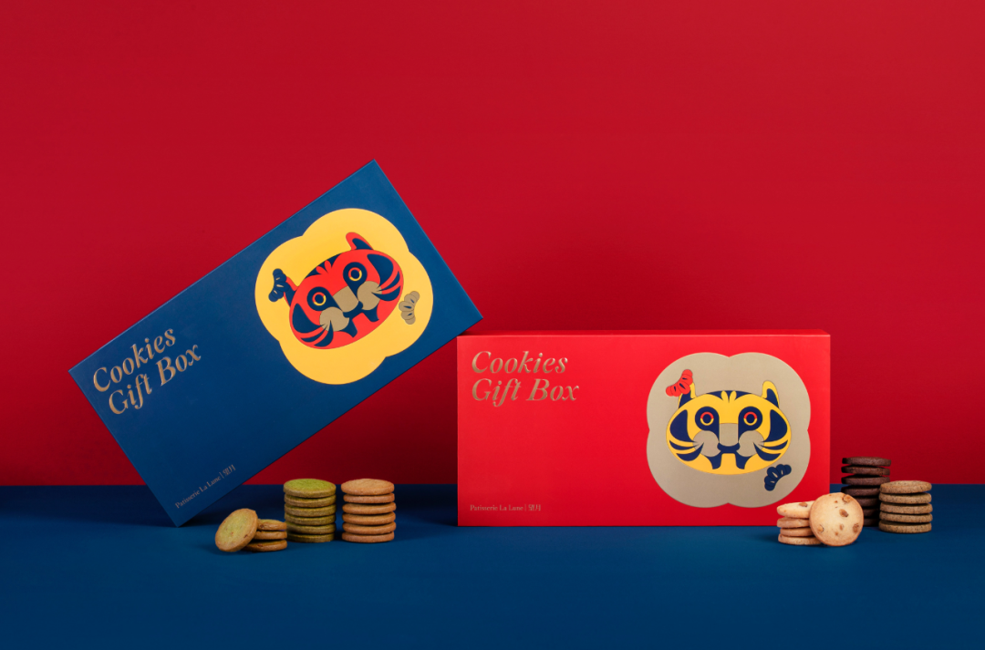 这是由中国香港设计工作室Pengguin hk 为香港糕点品牌望月(Patisserie La Lune)打造的虎年礼盒包装。礼盒内包含不同口味的曲奇饼干、蝴蝶酥和朱古力脆脆。